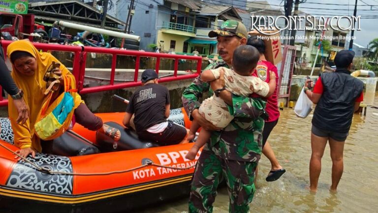 Tangerang Selatan (KARONESIA.COM) – Di tengah genangan air yang merendam permukiman warga Pondok Kacang Timur, Kecamatan Pondok Aren, Minggu pagi (8/3/2026), sebuah pemandangan sederhana namun menyentuh hati terjadi. Seorang Babinsa dengan hati-hati menggendong seorang anak kecil, menuntunnya keluar dari rumah menuju perahu karet agar bisa melewati genangan air dengan aman. Hujan berintensitas tinggi yang mengguyur…