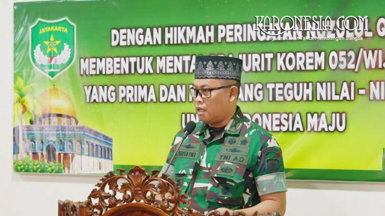 Tangerang (KARONESIA.COM) – Korem 052/Wijayakrama menggelar peringatan Nuzulul Qur’an 1447 Hijriah dengan khidmat di Masjid Al Ikhlas Makorem 052/Wkr, Tangerang, Senin (9/3/2026). Kegiatan ini bertujuan memperkuat mental, akhlak mulia, dan nilai tauhid prajurit TNI, sekaligus menumbuhkan kesadaran spiritual di bulan suci Ramadhan. Acara dihadiri Kasrem 052/Wkr Kolonel Inf Ato Sudiatna, para Kasi, prajurit, PNS Korem…