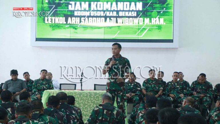 Kab Bekasi (KARONESIA) – Komandan Distrik Militer (Dandim) 0509/Kabupaten Bekasi yang baru, Letkol Arh Sabdho Aji Wibowo, resmi memperkenalkan diri kepada seluruh personel dalam kegiatan Jam Komandan di Aula Makodim 0509, Kompleks Plaza Pemda Kabupaten Bekasi, Desa Sukamahi, Cikarang Pusat,…