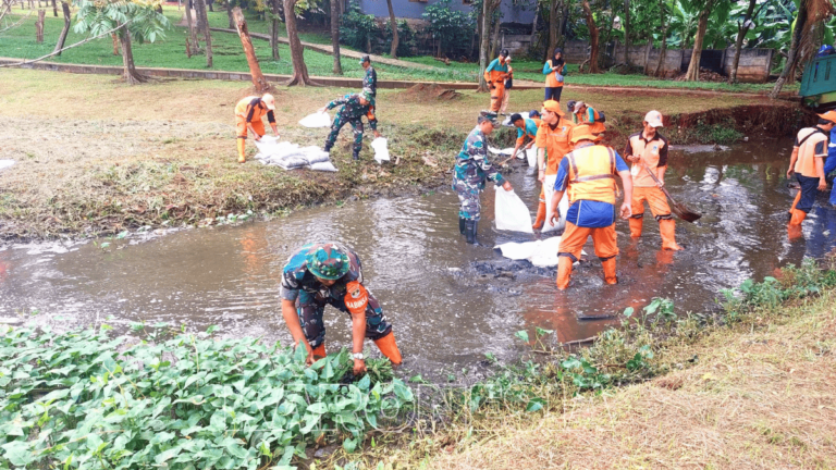 Babinsa Koramil Cipayung dan PPSU membersihkan sampah di Kali Taman Bambu, Jakarta Timur.(foto)