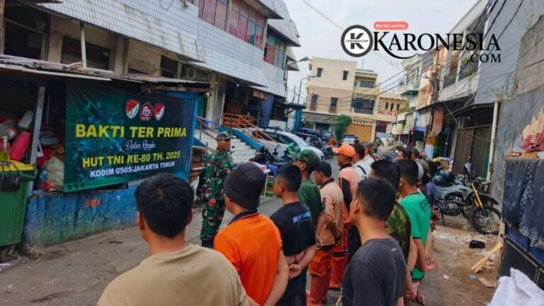Jakarta Timur, KARONESIA | Babinsa Koramil Pulogadung, Sertu Ari Kristiyono, menggelar kegiatan Bakti Teritorial Prima dengan membersihkan Pasar Pagi Rawamangun, Jakarta Timur, Minggu (14/9/2025). Kegiatan ini digelar dalam rangka memperingati Hari Ulang Tahun TNI ke-80. Aksi bersih-bersih dilakukan di halaman…
