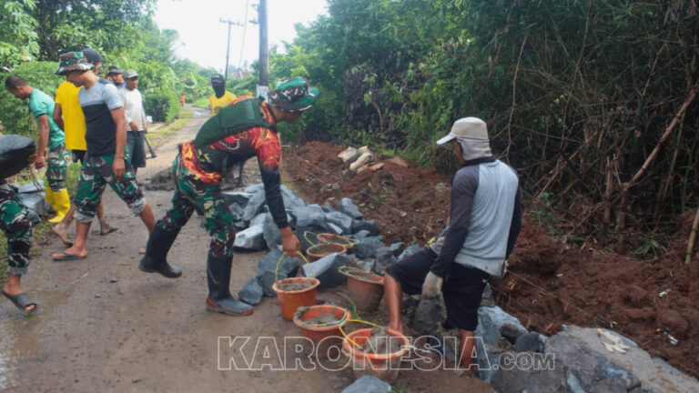 Satgas TMMD ke-123 bersama warga Kampung Namprak gotong royong membangun turap cegah banjir.