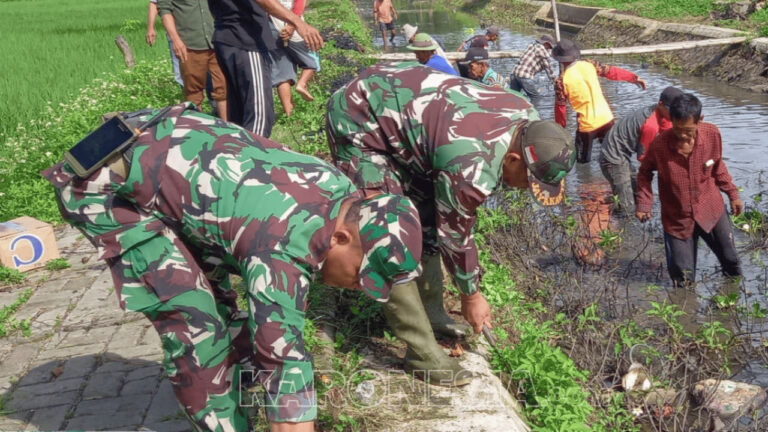 Babinsa dan warga Desa Gunung Kaler bergotong royong membersihkan saluran irigasi. (foto)