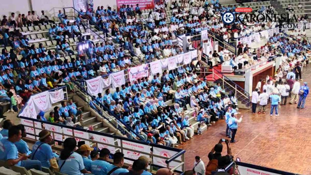 Jakarta, KARONESIA.COM | Padepokan Pencak Silat Taman Mini Indonesia Indah (TMII) dipenuhi ribuan relawan Prabowo Subianto yang hadir dalam Apel Kebangsaan, Sabtu (21/9/2025). Selain orasi politik, acara ini menyuguhkan pertunjukan seni tradisional yang menghidupkan suasana kebersamaan.