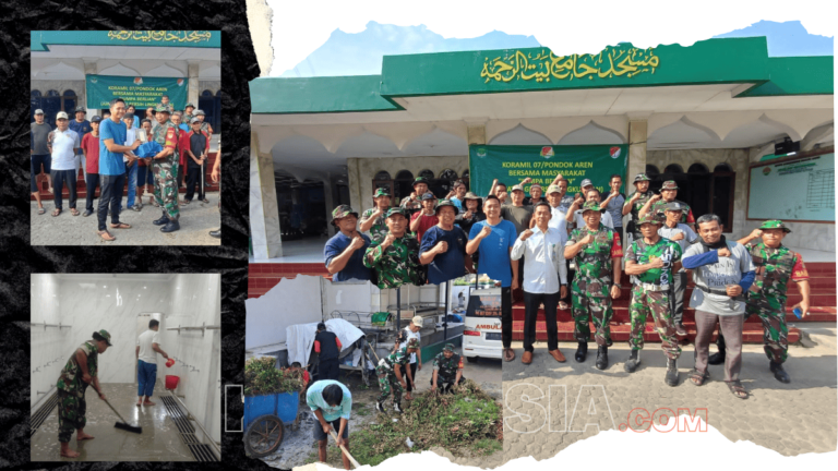 Danramil Pondok Aren Mayor Arm Sidik Abriyanta bersama warga dan pengurus masjid membersihkan Masjid Baiturrahman dalam program “Jumpa Berlian”. (foto)