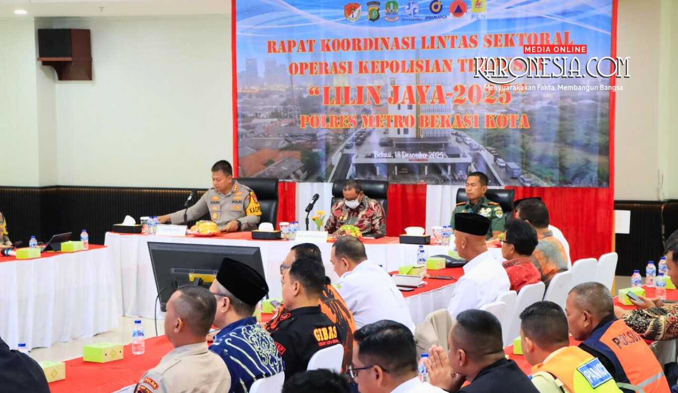 Kota Bekasi, KARONESIA.com | Komandan Kodim 0507/Bekasi Kolonel Arm Krisrantau Hermawan, S.H., M.I.Pol mengikuti kegiatan Rapat Koordinasi Lintas Sektoral dalam rangka Operasi Lilin Jaya 2025 yang diselenggarakan oleh Polres Metro Bekasi Kota, Kamis, (18/12/2025).