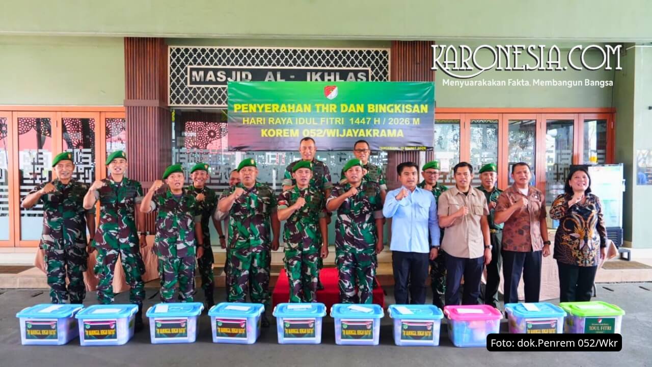 Tangerang (KARONESIA.COM) – Untuk merayakan Lebaran bersama keluarga, ratusan prajurit dan pegawai sipil Korem 052/Wijayakrama berkumpul di halaman Masjid Al Ikhlas, Jumat (13/3/2026). Mereka menerima Tunjangan Hari Raya dan bingkisan Idul Fitri 1447 H langsung dari tangan Komandan Korem.