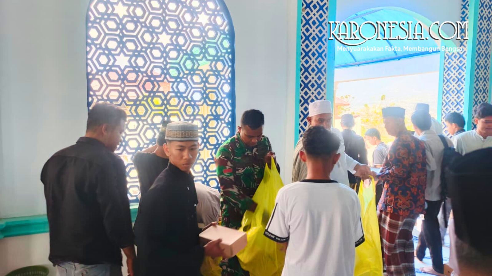 Sejumlah prajurit berbaur dengan warga di halaman masjid. Mereka menyalami jamaah satu per satu sebelum menyerahkan makanan siap saji kepada masyarakat yang hadir, termasuk lansia dan pekerja harian di sekitar kawasan tersebut.