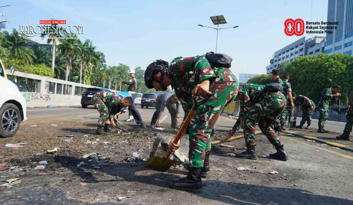 Jakarta, KARONESIA | Prajurit Kodam Jaya bergerak cepat membersihkan jalur umum strategis di kawasan Slipi hingga depan Kompleks MPR/DPR, Sabtu (30/8). Langkah ini dilakukan usai kerusakan fasilitas akibat unjuk rasa beberapa waktu lalu.